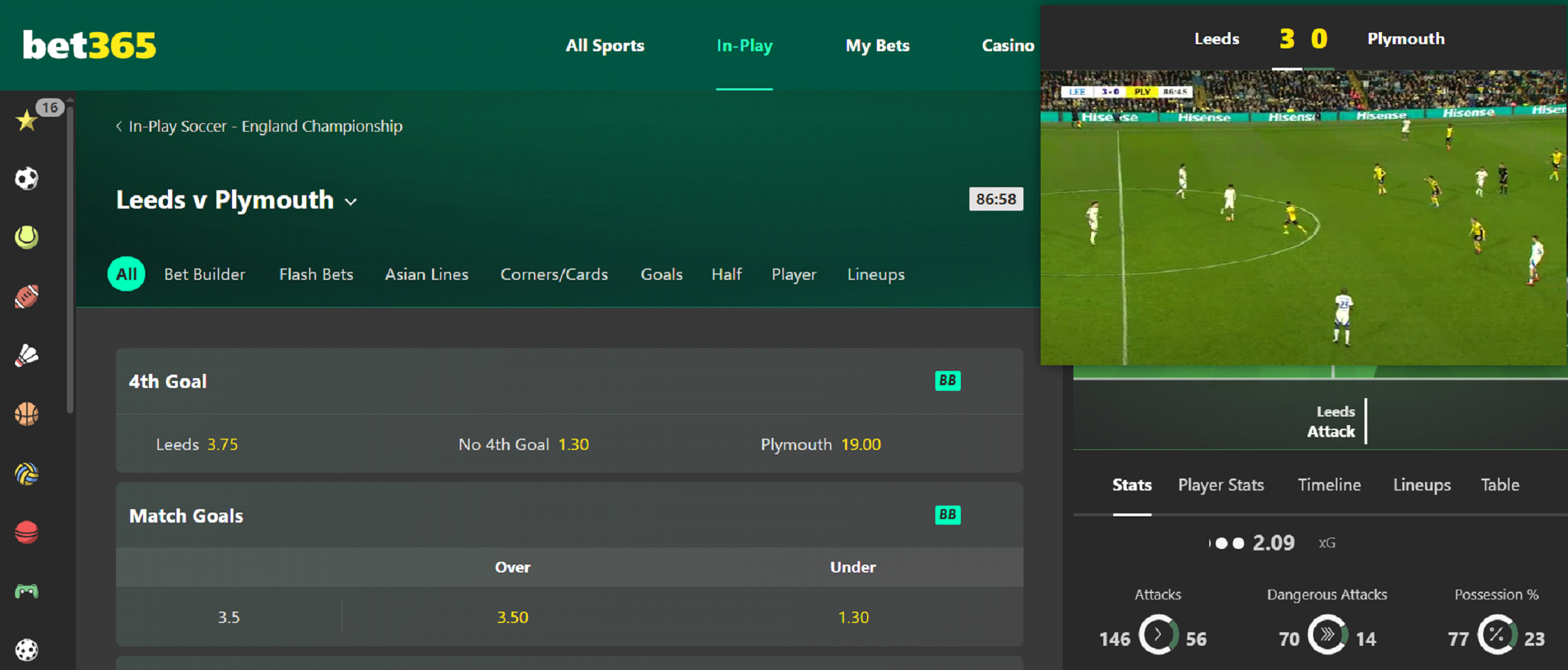 Dans un autre exemple, Leeds s’est imposé contre Plymouth dans ce match du très exigeant Championship. Compte tenu du contexte, on pouvait s’attendre à voir Leeds se créer des occasions et concrétiser sa domination. Un pari en faveur de Leeds était envisageable, et une prise de risque sur un H-1,5 pouvait se justifier, tout comme un multi-goal 2-4 par exemple…