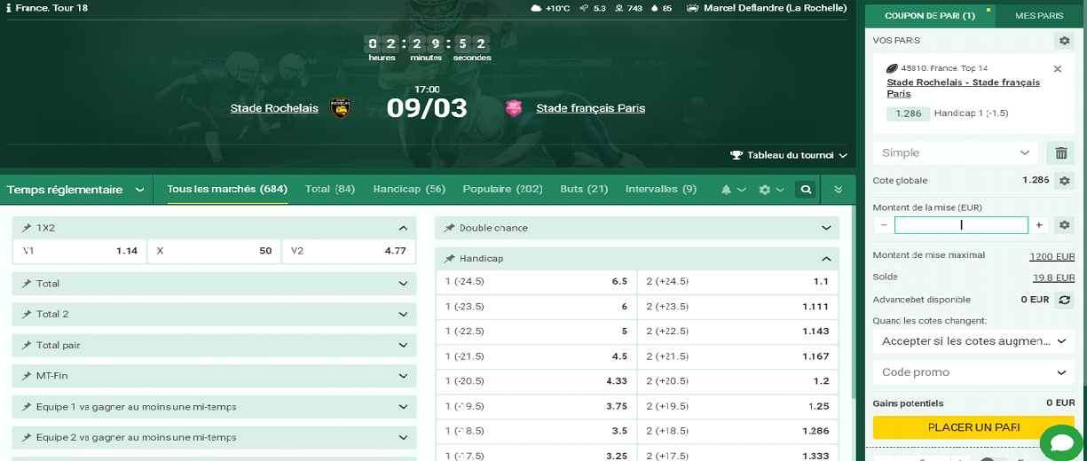 Enfin, en rugby, un exemple intéressant dans un match de Top14. Dans des configurations optimales, un petit H-1,5/ H-2,5/ H-4,5 peut souvent se réveler plus judicieux que la simple victoire, et offrir une cote plus avantageuse sans pour autant prendre un risque excessif.